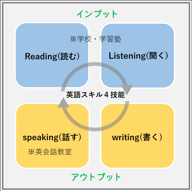 また、一般的な英語学習塾では読む・聞くの授業を中心に行い、英会話スクールでは話すことに重点を置いて授業を行いますが、